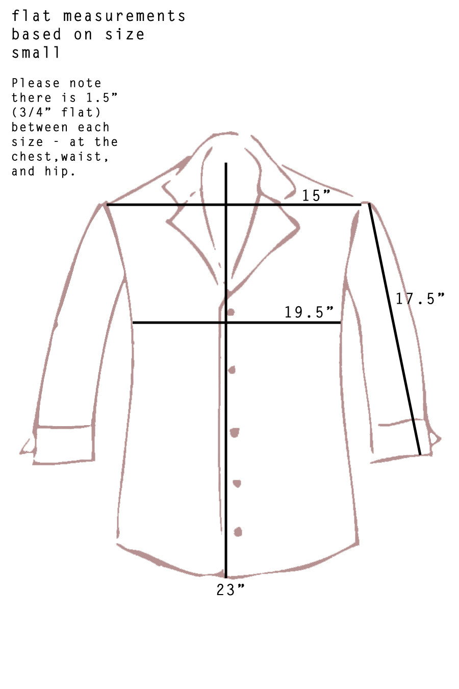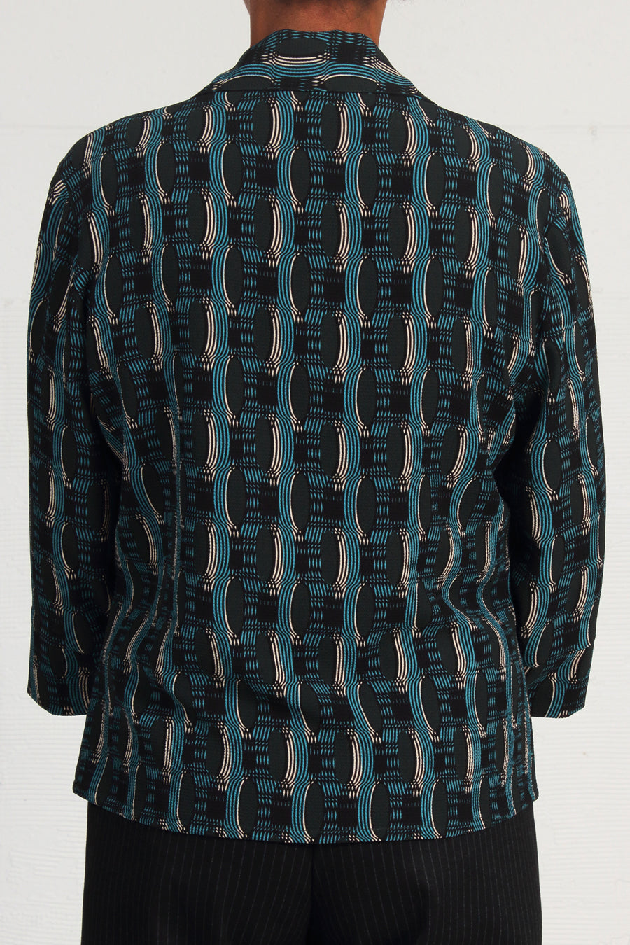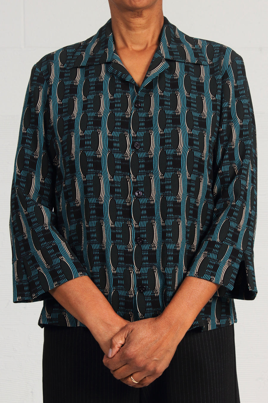 A classic Comrags piece - the Metropolis Shirt! The split cuff on a 3/4 sleeve and no darts make it an easy style to wear. Good as a light jacket too! The background is an earthy green with a black and teal print.