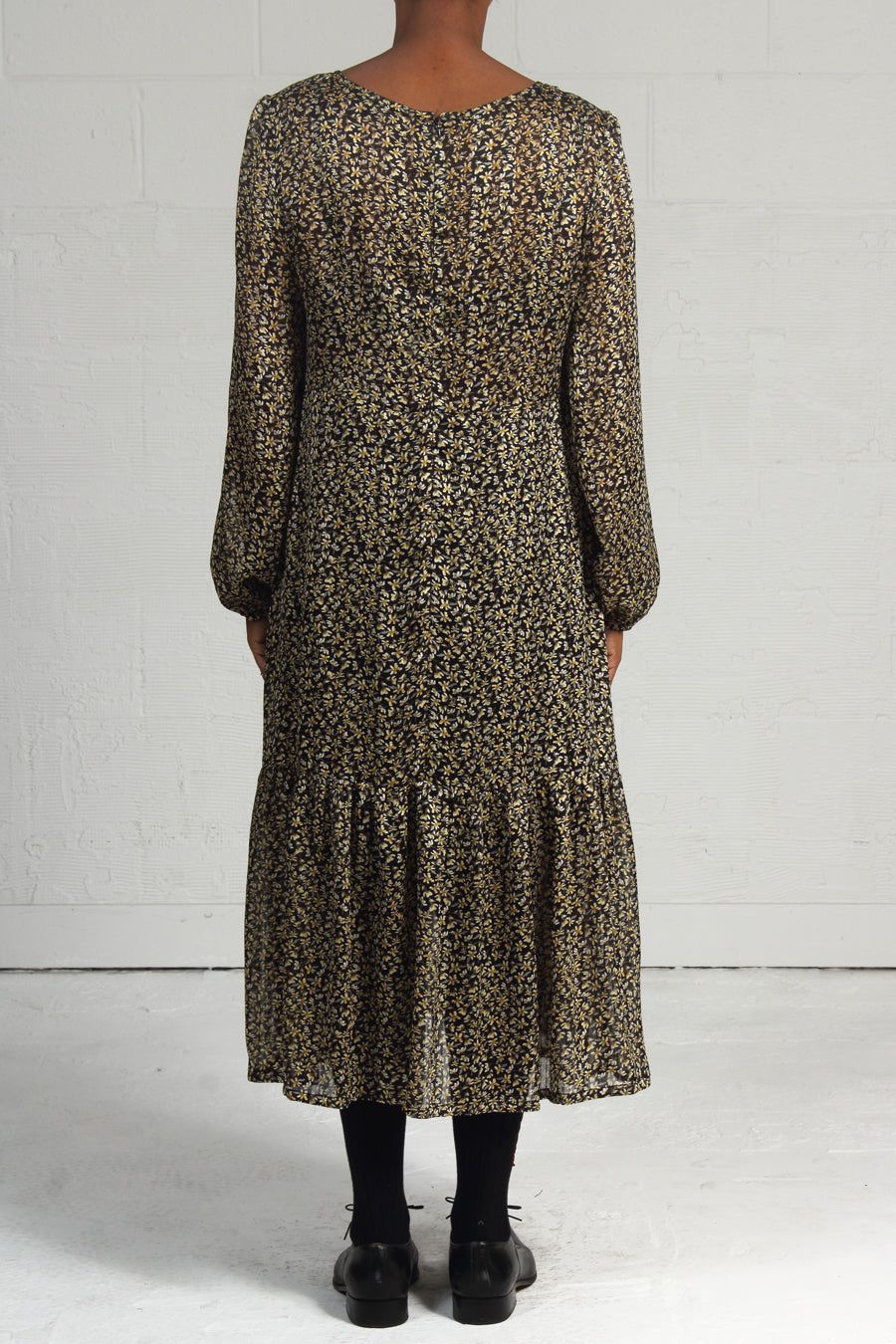 An easy dress that is slim at the shoulders and ruffled by the hem. Elastic cuffs.