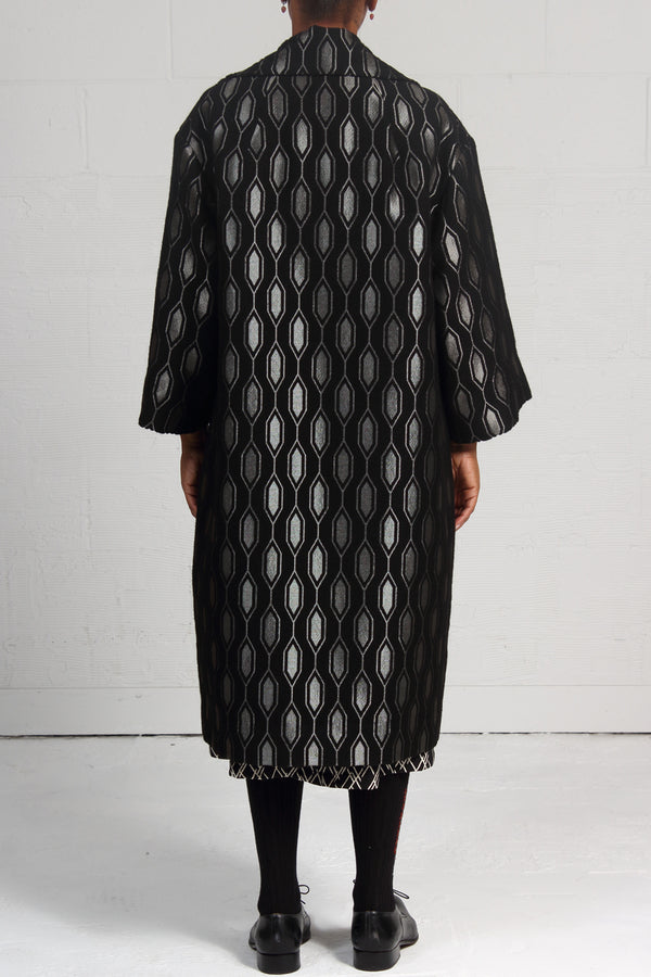 This fabric adds a little drama to a simple coat - over sized coat with wide cropped sleeves.  *Hexagon - 59% acrylic, 25% wool, 10% acetate, 6% nylon *Washing Instructions: Dry clean only *Runs true to size *Made in Canada