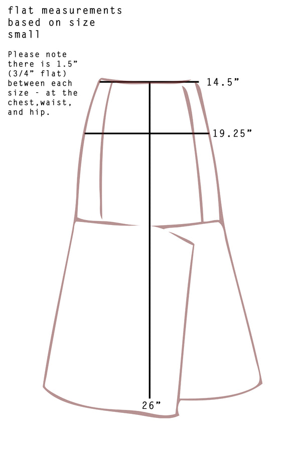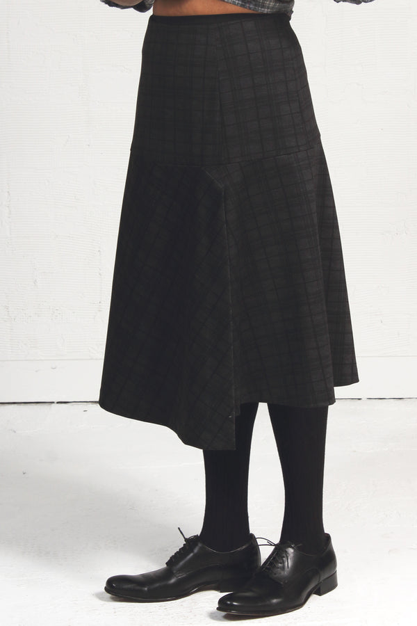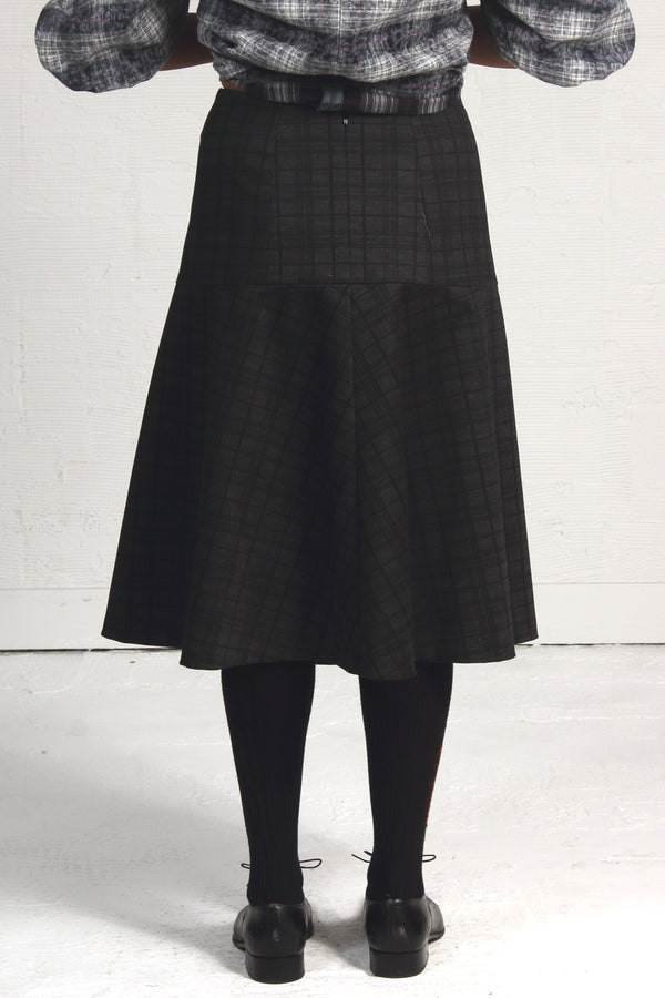 Fitted through the hips and flared at the bottom with an assymetrical wrap. Flattering and comfortable. *Gray Plaid - 55% polyester, 40% rayon, 5% spandex *Washing Instructions: Hand wash or machine wash cold, hang dry or lay flat *Runs true...
