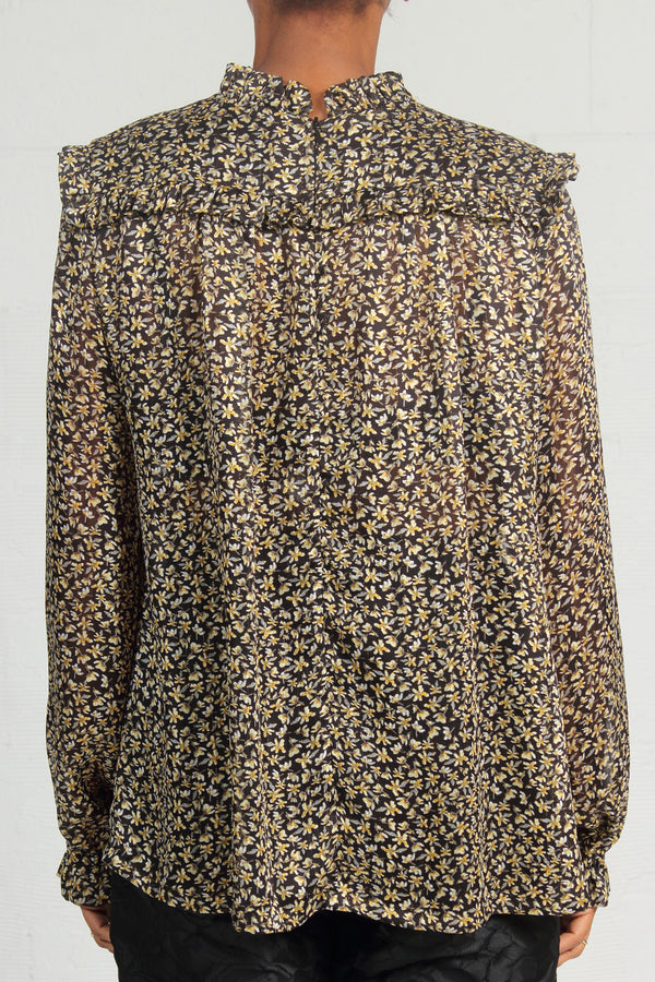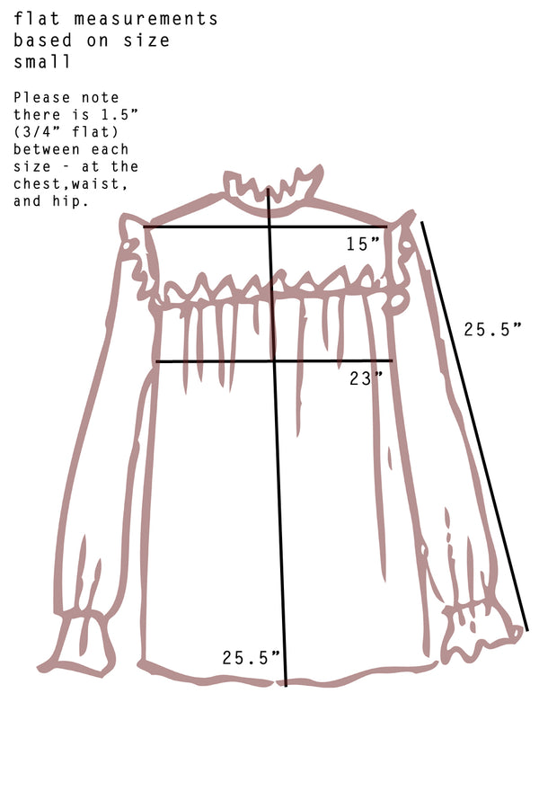 Loving this 70's style shirt - flowy and sweet! *Tiny Print - 100% polyester *Please note - slightly sheer with a bit of metallic *Washing Instructions: Hand wash, hang dry *Runs true to size *Made in Canada